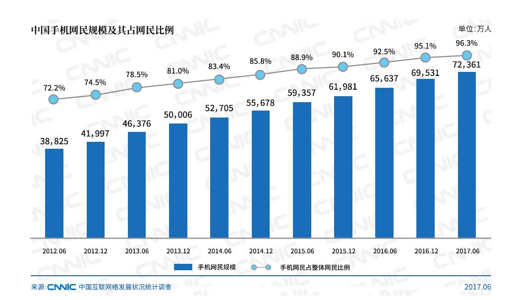《第32次中國(guó)互聯(lián)網(wǎng)絡(luò)發(fā)展?fàn)顩r統(tǒng)計(jì)報(bào)告》顯示,截至2013年6月底,我國(guó)手機(jī)網(wǎng)民數(shù)量為4.6億,較2012年底增加約4379萬(wàn)人,半年時(shí)間增加4%,與此同時(shí),我國(guó)網(wǎng)民規(guī)模達(dá)到5.91億,半年共計(jì)新增網(wǎng)民2656萬(wàn)人,互聯(lián)網(wǎng)普及率為44.1% ,僅提升了2.0個(gè)百分點(diǎn)。保持了2012初,手機(jī)網(wǎng)民增幅遠(yuǎn)超網(wǎng)民整體增幅的態(tài)勢(shì)。