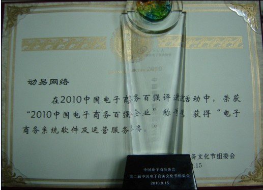 2010年9月15-17日,由中國電子商務(wù)協(xié)會和杭州余杭區(qū)政府主辦的“第二屆中國電子商務(wù)文化節(jié)暨2010中國電子商務(wù)百強峰會”盛大開幕,會上揭曉了我國首個電子商務(wù)百強榜。動易軟件作為國內(nèi)優(yōu)秀的一體化電子商務(wù)網(wǎng)站及網(wǎng)站系統(tǒng)整合解決方案提供商,與阿里巴巴、當當、卓越、李寧、京東等知名企業(yè)一道成功入選電子商務(wù)百強企業(yè),并榮膺“電子商務(wù)系統(tǒng)軟件及運營服務(wù)獎十強”獎項!