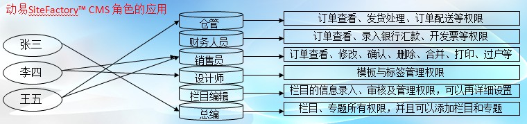 動(dòng)易SiteFactory? CMS的角色是通過(guò)標(biāo)準(zhǔn)RBAC(基于角色的訪(fǎng)問(wèn)控制)模型實(shí)現(xiàn)的,下圖為SiteFactory? CMS中角色應(yīng)用舉例示意圖。我們建立了“倉(cāng)管”、“財(cái)務(wù)人員”、“銷(xiāo)售員”、“設(shè)計(jì)師”、“欄目編輯”、“總編”等角色,并且它們都具有相對(duì)獨(dú)立的控制權(quán)限。將張三、李四、王五賦予不同的角色后,他們就擁有了一系列權(quán)限。從圖中看出用戶(hù)與角色是多對(duì)多的關(guān)系。即一個(gè)用戶(hù)可以屬于多個(gè)角色之中,一個(gè)角色可以包括多個(gè)用戶(hù)。
